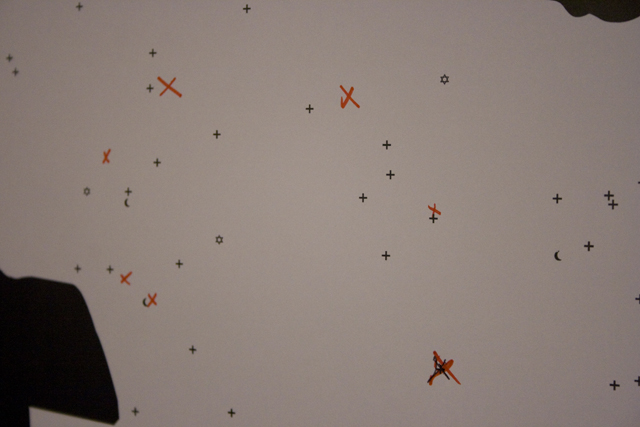 This map was covered by a confessional style cloth. The visitor would write their secret on a piece of paper, put it in an envelope and post it into a box. Then they would mark on the map with a red cross where that secret happened in the borough of Hackney.