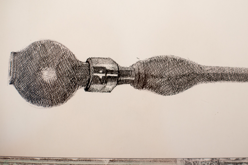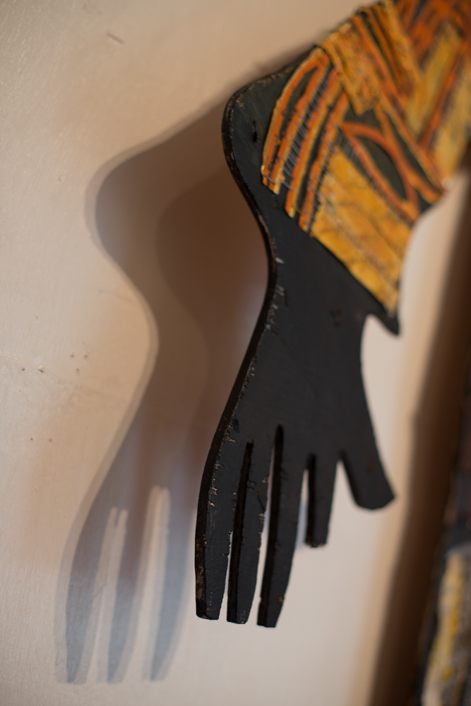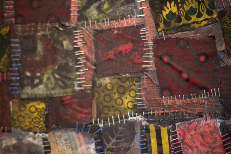 In Instead of the war on Poverty we got the war on Alcohol features painful looking colourful staples in a visually beautiful pattern joining Lesso materials together. Possibly a metaphor for Kenyan multiple identities. The mask head is a reflexive comment on the tradition of African culture, and reminds the viewer of their assumption of ‘african art’ by modernising it with some specs.