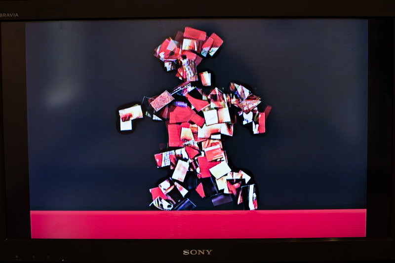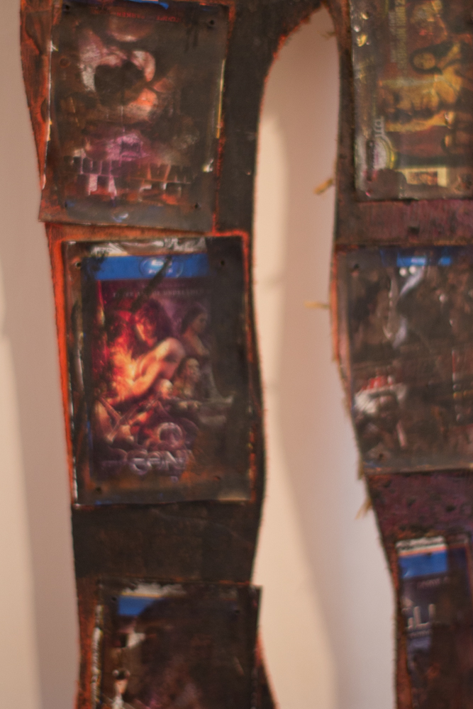 Their legs consist of collage of found images on DVD, reminiscent of religious paintings by masters of The Renaissance. The artist referencing ideology of our culture, making popular DVD characters into possible religious figures.