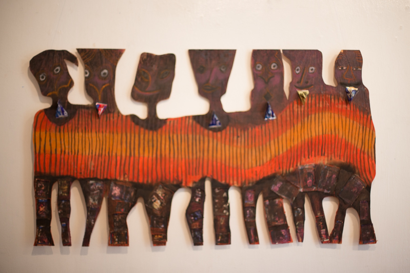 In the depiction of Boys wa mkali – ‘The bad boys’ we see a playful but serious pun on the boys who drink alcohol for breakfast. Spirit bottle labels are folded into milk carton shaped triangles, implying that instead of Chai for breakfast, alcohol is on the menu. These Boys wa mkali cut out in sculpture with warped almost bird like face features, are conjoined together by an orange river of warmth.
